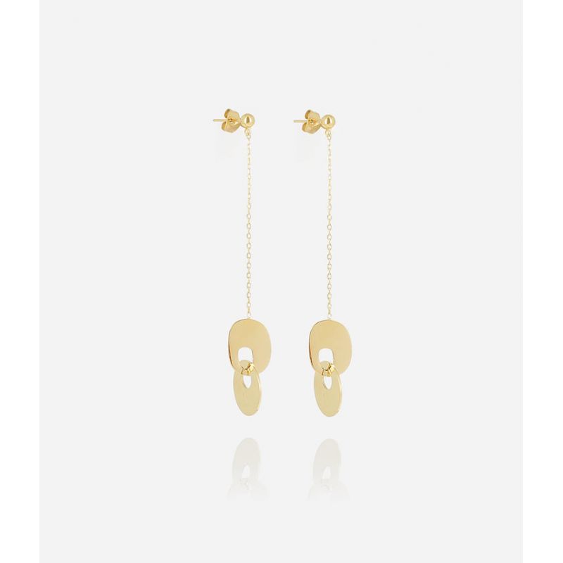 Boucles d'oreilles longues en acier uni ou doré à l'or fin formées d'une chaine au bout de laquelle sont attachés 2 maillons de métal.