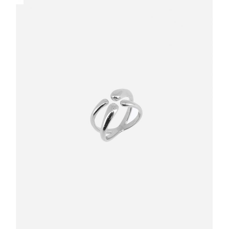 Bague en acier uni ou doré à l’or fin. Cette bague est composée de 2 anneaux arrondis qui se rejoignent au milieu et forment de l'autre côtés 4 bouts arrondis.